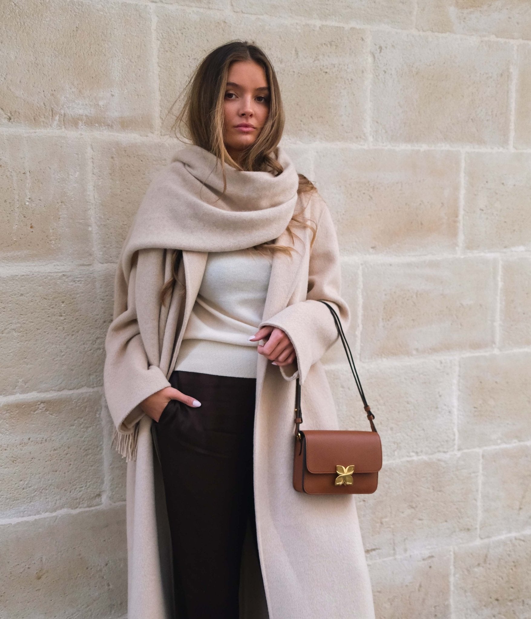 Its rich, enveloping Marron tone pairs beautifully with soft shades like ivory, sandy beige, or blush pink, creating a balanced and luminous look. For a bolder silhouette, it also complements deeper hues such as navy blue, forest green, or burgundy, which highlight the depth of its color.